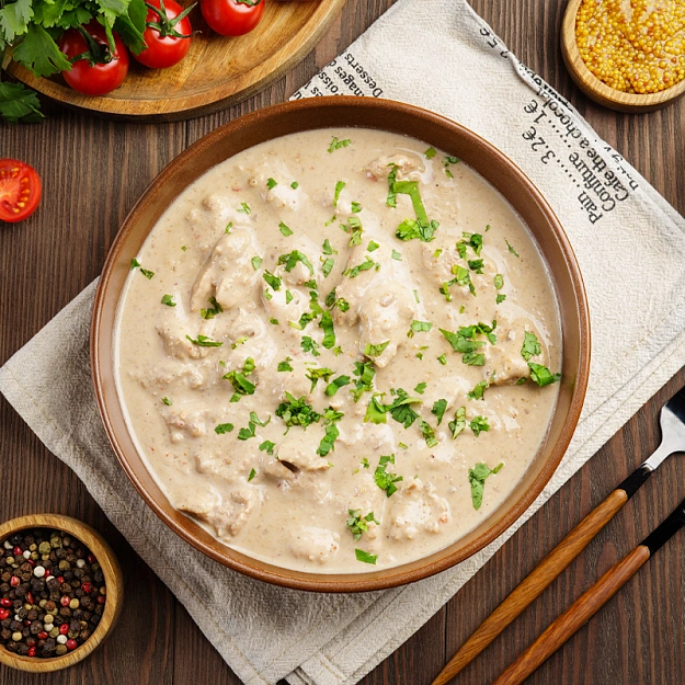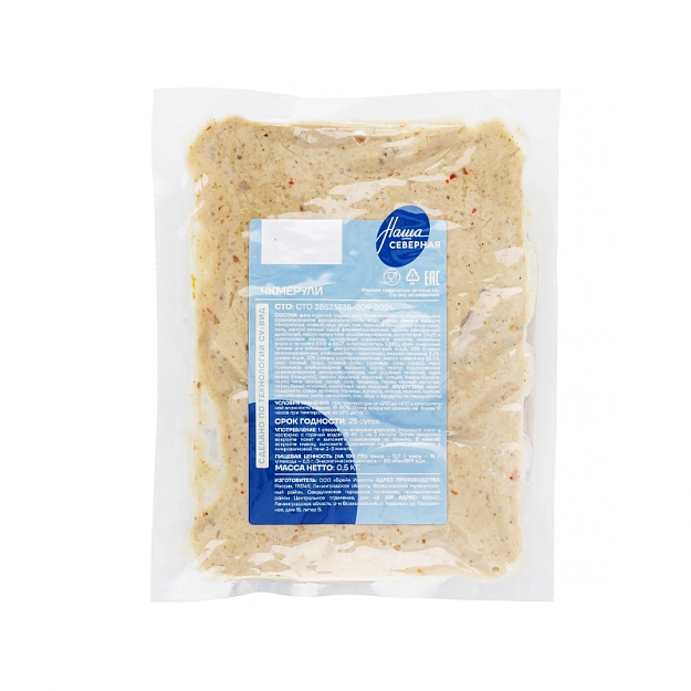 Филе куриной грудки, соус Ореховый (масло подсолнечное рафинированное дезодорированное, вода, сахар, семена кунжута обжаренные, соевый соус (вода, соя, пшеница, соль), уксус спиртовой, соль, желток яичный сухой ферментированный, арахис обжаренный дробленый, масло кунжутное нерафинированное, загустители Е1422 и ксантановая камедь, консервант сорбиновая кислота, усилители вкуса и аромата Е631 и Е627, антиокислитель Е385), крем сливочный "сливки для взбивания" ультрапастеризованный, м.д.ж. 33% (сливки нормализованные, стабилизатор - карагинан), молоко питьевое 3,2%, сливки м.д.ж. 22% (сливки нормализованные), масло сливочное 82,5%, соус соевый (вода, соевые бобы, пшеница, соль, сахар), мука пшеничная хлебопекарная высшего сорта, масло подсолнечное рафинированное дезодорированное, лук сушёный молотый, ядра ореха (грецкого), чеснок сушёный молотый, специя Хмели-Сунели, перец чили хлопья, сахар, соль пищевая, перец чёрный молотый, перец белый молотый, мускатный орех молотый.