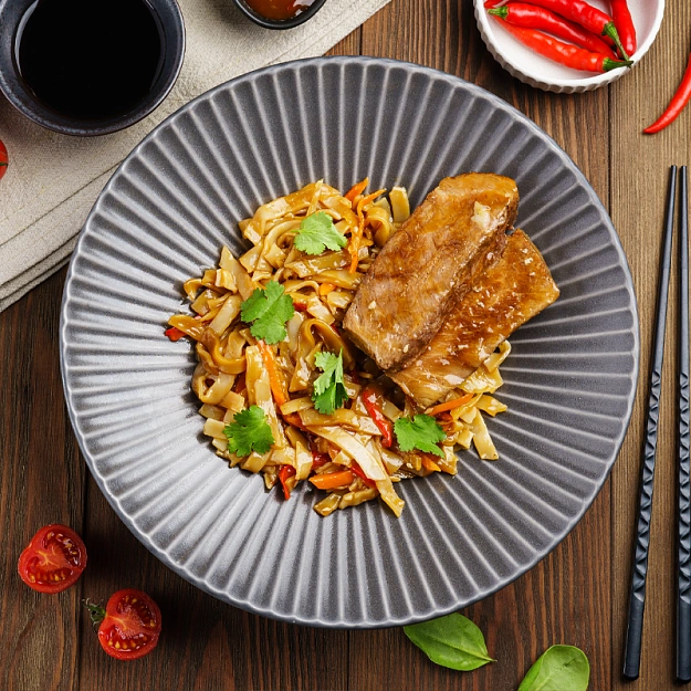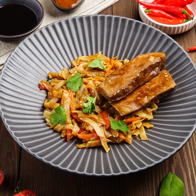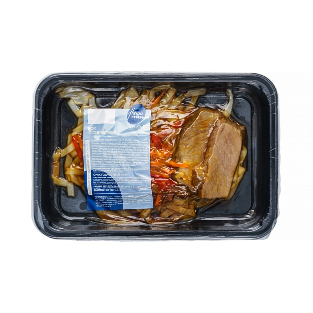 Говядина, лапша рисовая (мука рисовая, вода), морковь свежая, капуста белокочанная свежая, перец болгарский свежий, лук красный репчатый свежий, корень сельдерея свежий, ростки соевые свежие, паста карри красная (красный перец чили сушеный 21%, чеснок 21%, лемонграсс 16%, лук-шалот 16%, соль 14%, галангал 5%, каффир-лайм 5%, тмин 1%, кориандр 1%), соус Терияки (вода, сахар, соевый соус (вода, соевые бобы, пшеница, соль), уксус натуральный, загуститель дикрахмаладипат ацетилированный, соль, сироп карамельный, ароматизаторы натуральные (содержат глютен и сою), имбирь, регулятор кислотности кислота молочная, загуститель камедь ксантановая), масло растительно-кунжутное рафинированное, масло подсолнечное рафинированное дезодорированное, соль пищевая, перец чёрный молотый.